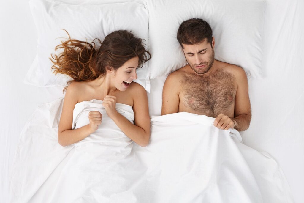 Picture of adult European bearded man and excited woman lying in bed and peeping under white blanket. Couple going to have sex in white bedrrom or hotel room. Love and relationships problems
